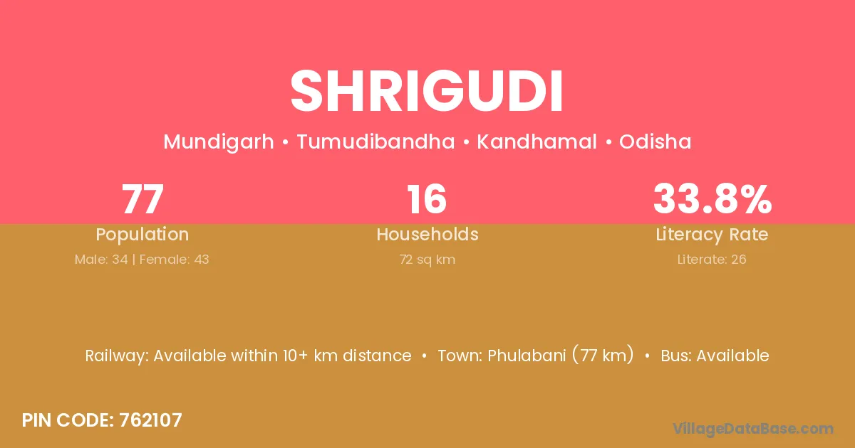 Phulabani (77 km) is the nearest town to Shrigudi village for major economic activities and is located approximately 77 km away.