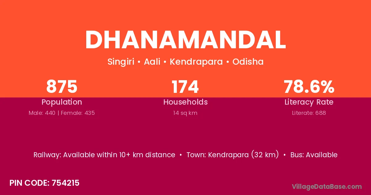 Dhanamandal village has a total population of 875 people, of which 440 are males and 435 are females.