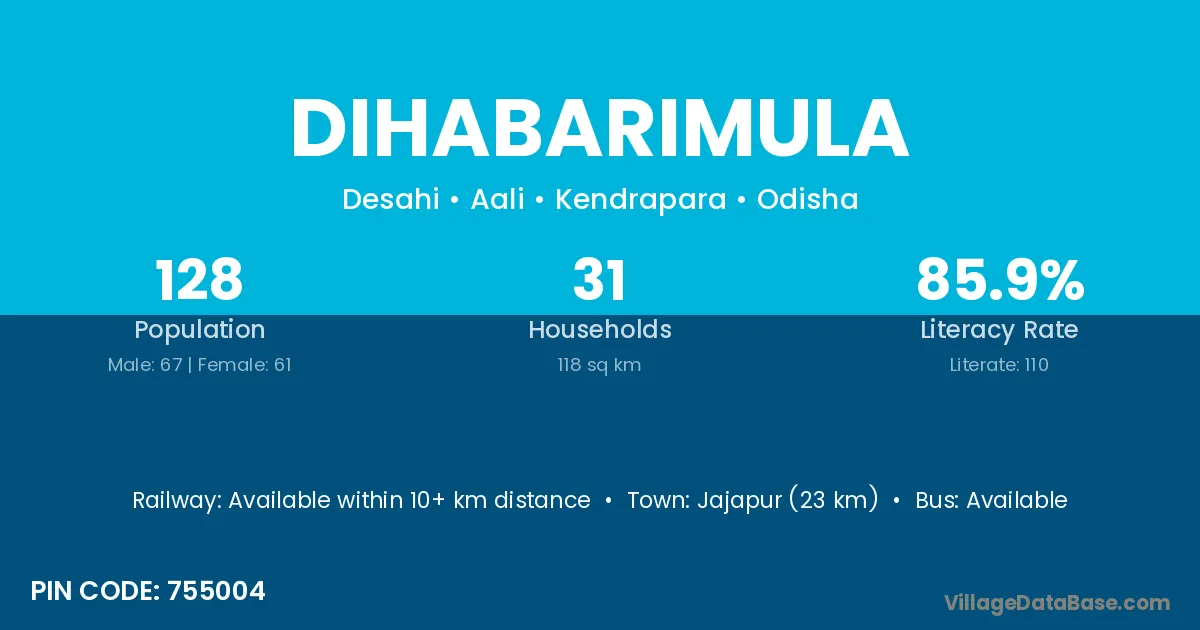 Jajapur (23 km) is the nearest town to Dihabarimula village for major economic activities and is located approximately 23 km away.