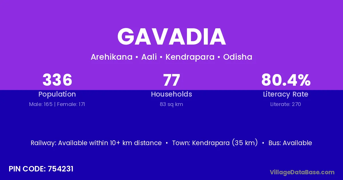 Kendrapara (35 km) is the nearest town to Gavadia village for major economic activities and is located approximately 35 km away.