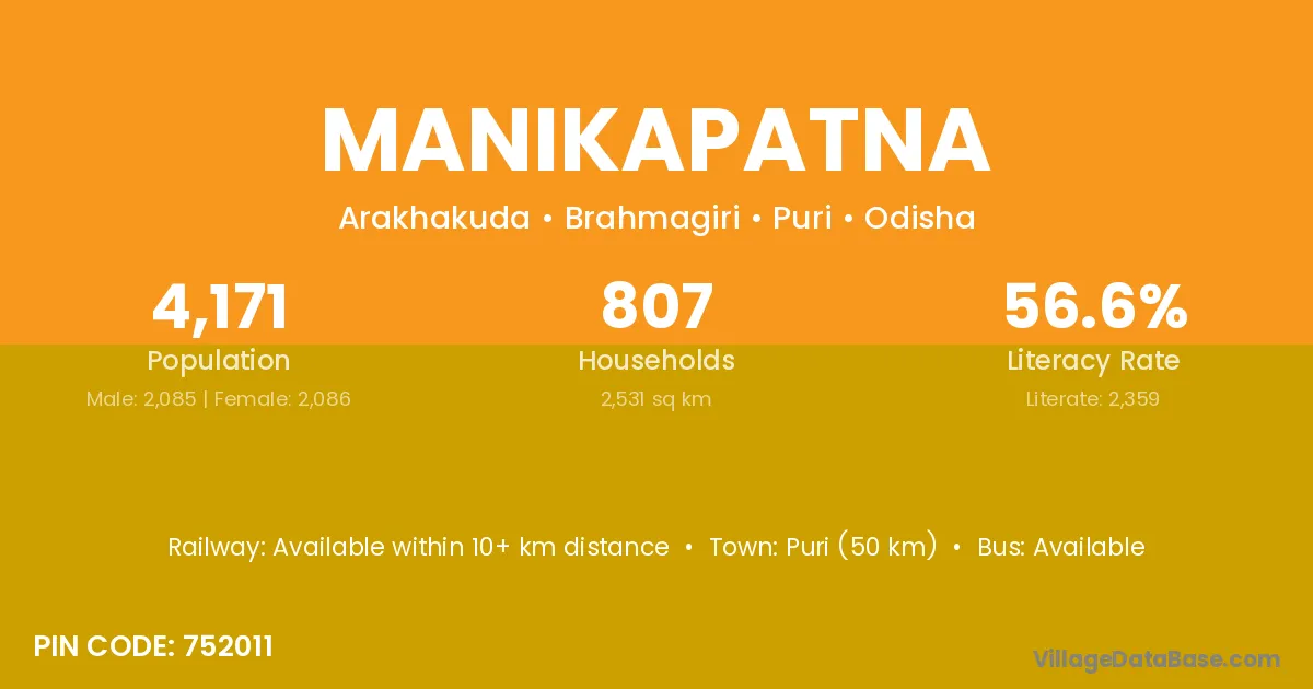 Pattamundai (10 km) is the nearest town to Manikapatna village for major economic activities and is located approximately 10 km away.