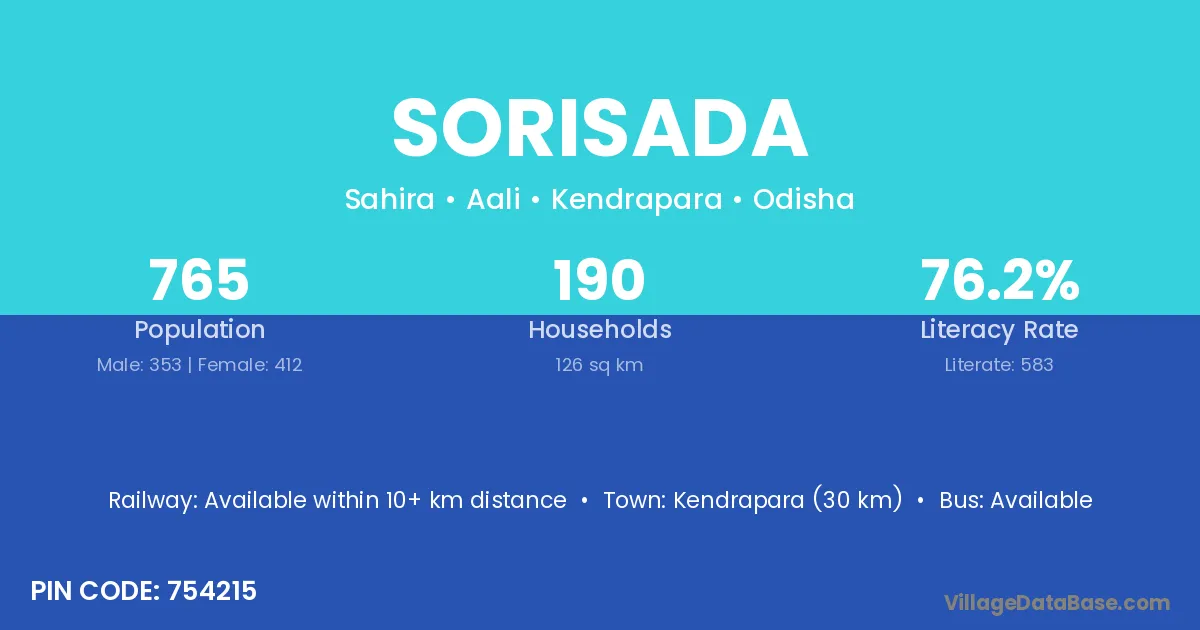 Kendrapara (30 km) is the nearest town to Sorisada village for major economic activities and is located approximately 30 km away.