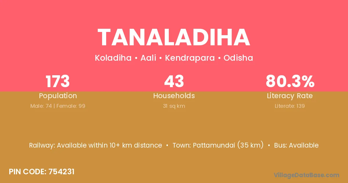 Pattamundai (35 km) is the nearest town to Tanaladiha village for major economic activities and is located approximately 35 km away.