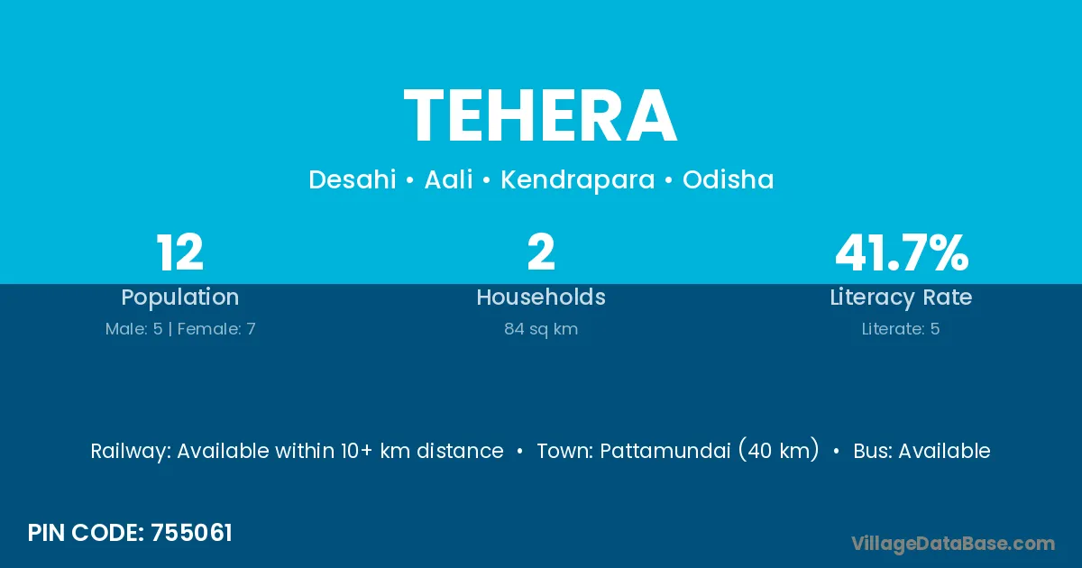 Pattamundai (40 km) is the nearest town to Tehera village for major economic activities and is located approximately 40 km away.