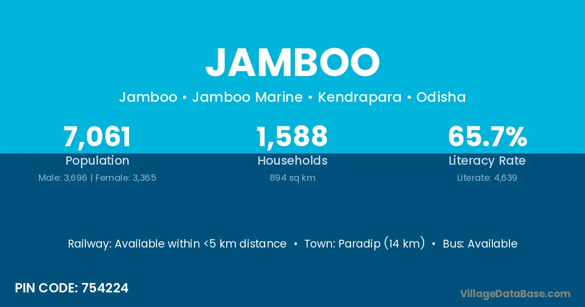 Paradip (14 km) is the nearest town to Jamboo village for major economic activities and is located approximately 14 km away.