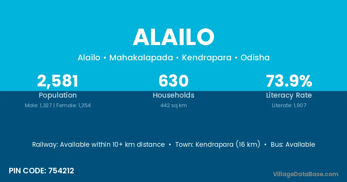 Kendrapara (16 km) is the nearest town to Alailo village for major economic activities and is located approximately 16 km away.