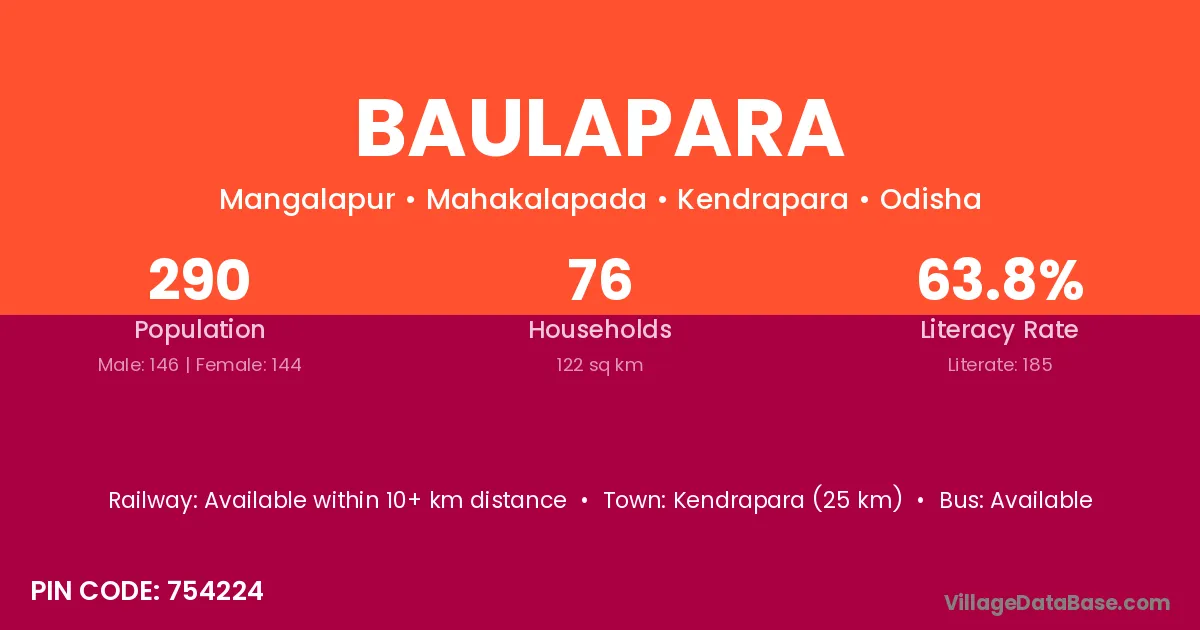 Kendrapara (25 km) is the nearest town to Baulapara village for major economic activities and is located approximately 25 km away.
