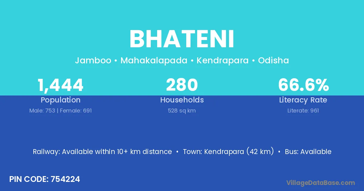 Kendrapara (42 km) is the nearest town to Bhateni village for major economic activities and is located approximately 42 km away.
