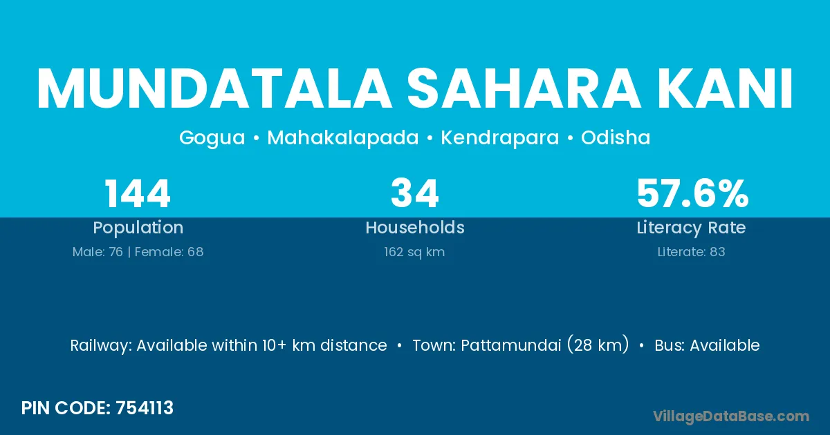 Pattamundai (28 km) is the nearest town to Mundatala Sahara Kani village for major economic activities and is located approximately 28 km away.