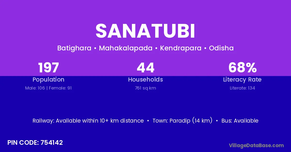 Paradip (14 km) is the nearest town to Sanatubi village for major economic activities and is located approximately 14 km away.
