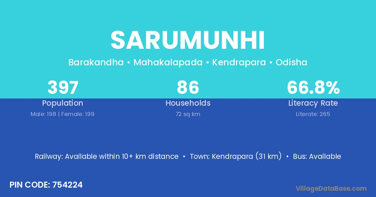 Sarumunhi village has a total population of 397 people, of which 198 are males and 199 are females.
