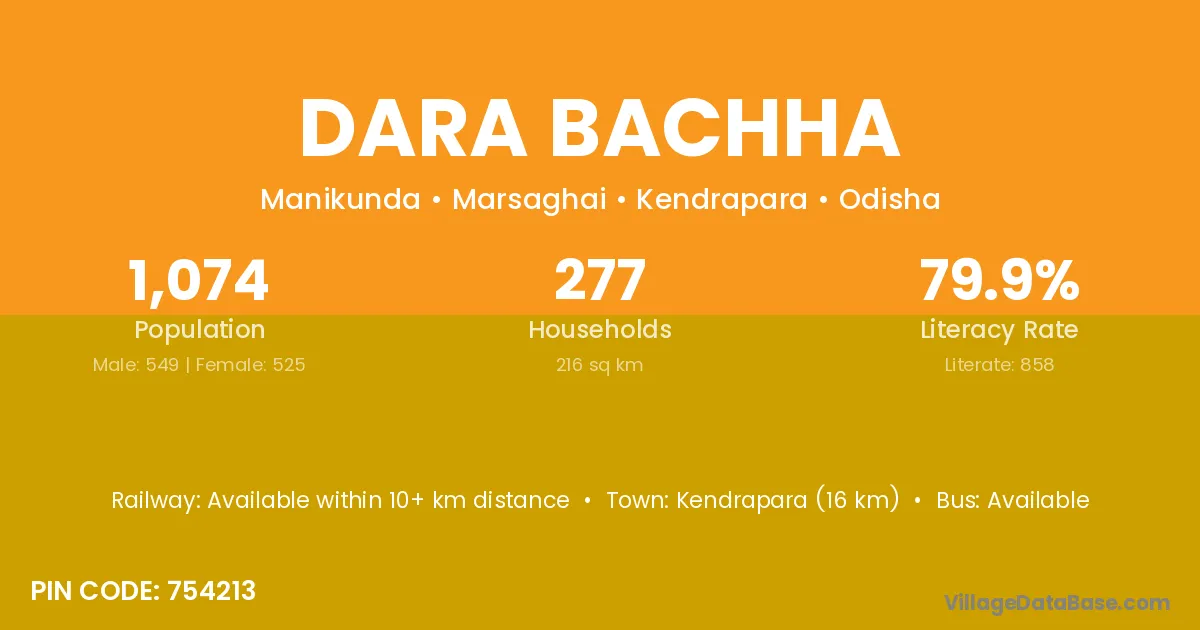 Kendrapara (16 km) is the nearest town to Dara Bachha village for major economic activities and is located approximately 16 km away.