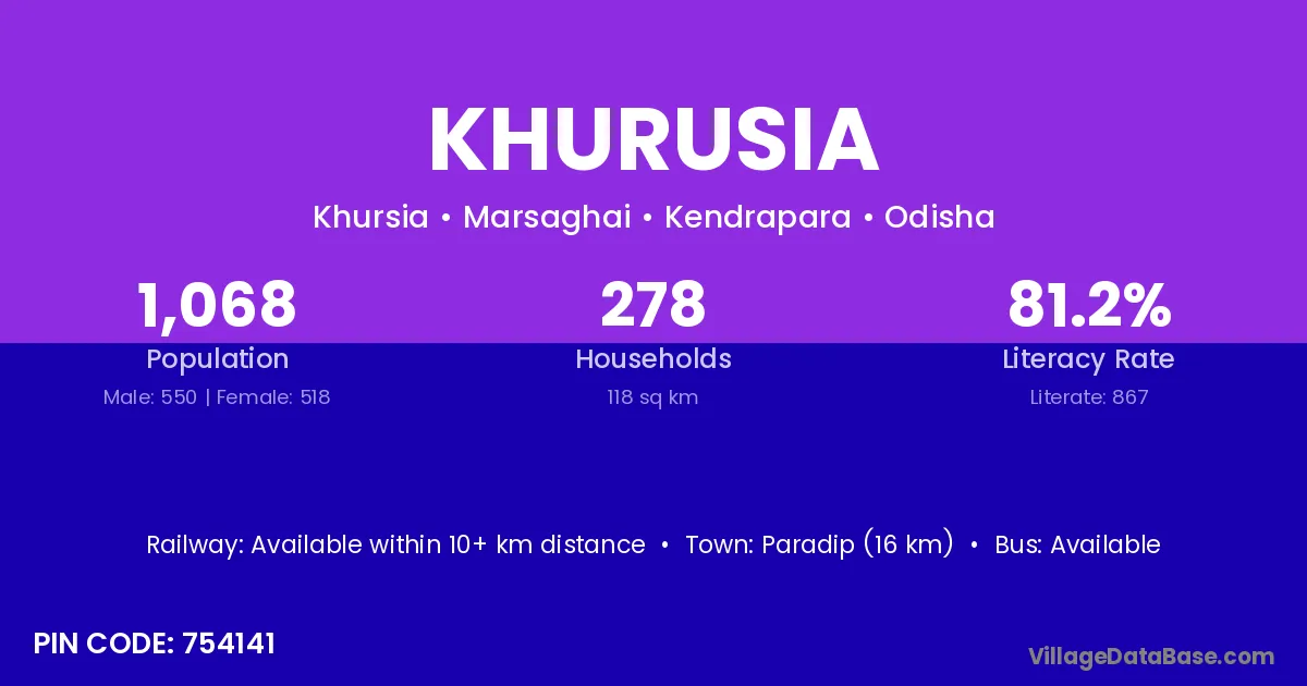 Paradip (16 km) is the nearest town to Khurusia village for major economic activities and is located approximately 16 km away.