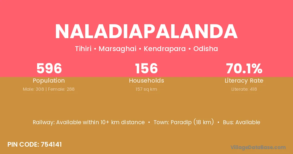 Paradip (18 km) is the nearest town to Naladiapalanda village for major economic activities and is located approximately 18 km away.