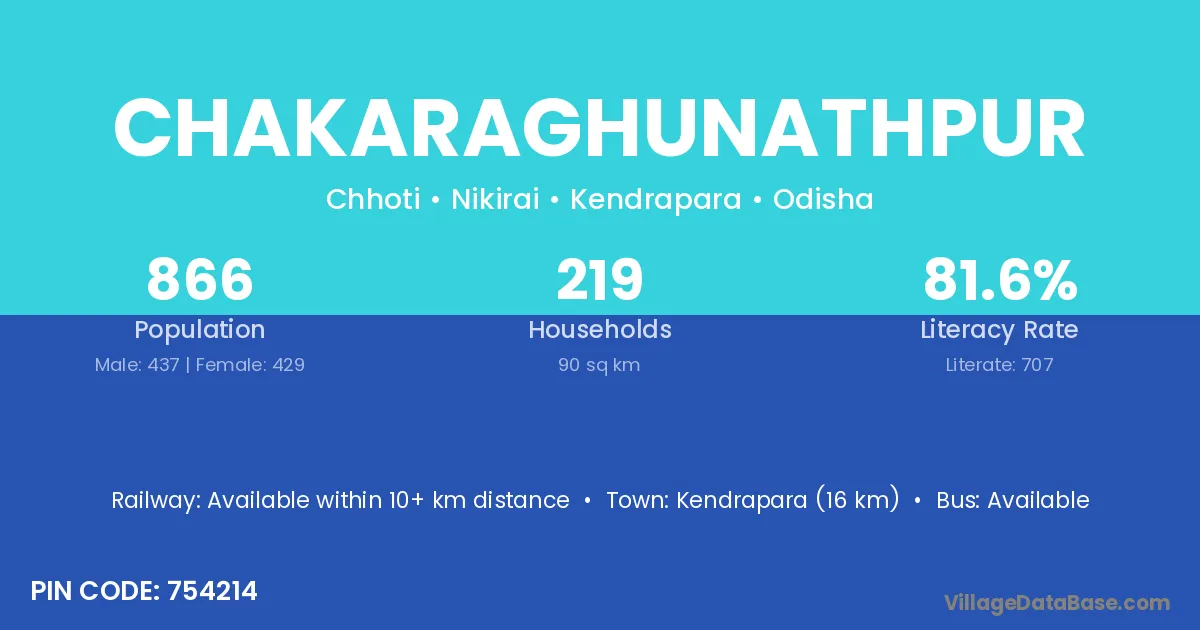 Kendrapara (16 km) is the nearest town to Chakaraghunathpur village for major economic activities and is located approximately 16 km away.