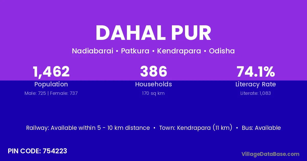 Kendrapara (11 km) is the nearest town to Dahal Pur village for major economic activities and is located approximately 11 km away.