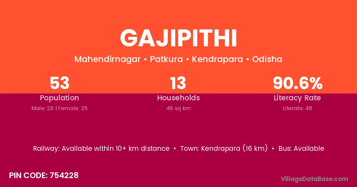 Kendrapara (16 km) is the nearest town to Gajipithi village for major economic activities and is located approximately 16 km away.
