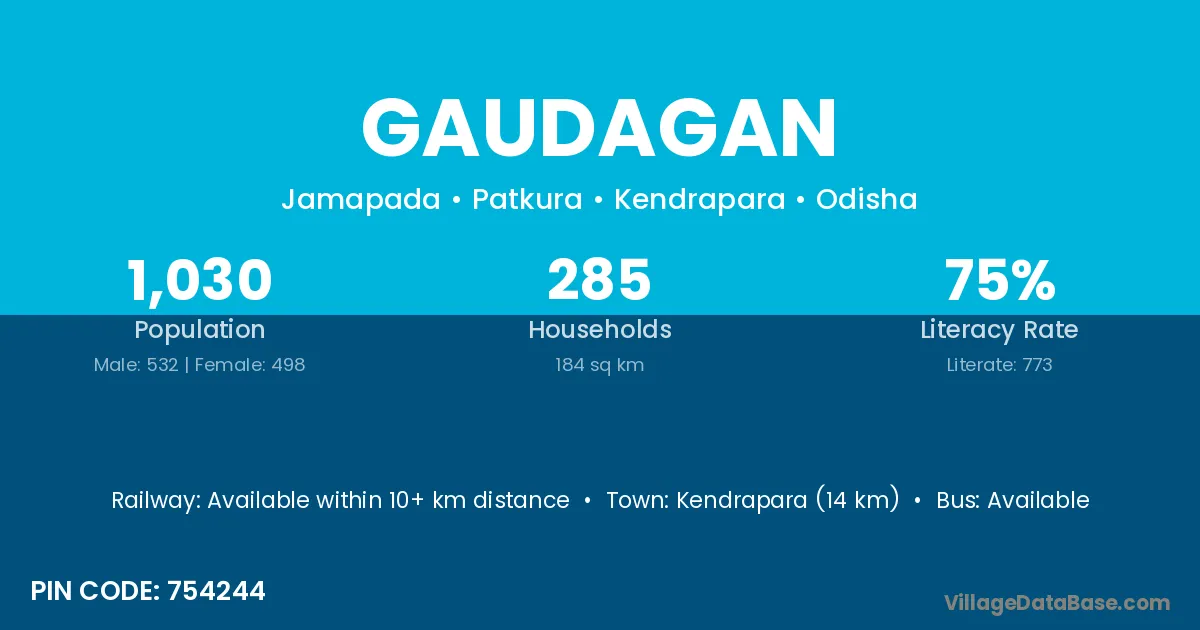 Kendrapara (14 km) is the nearest town to Gaudagan village for major economic activities and is located approximately 14 km away.