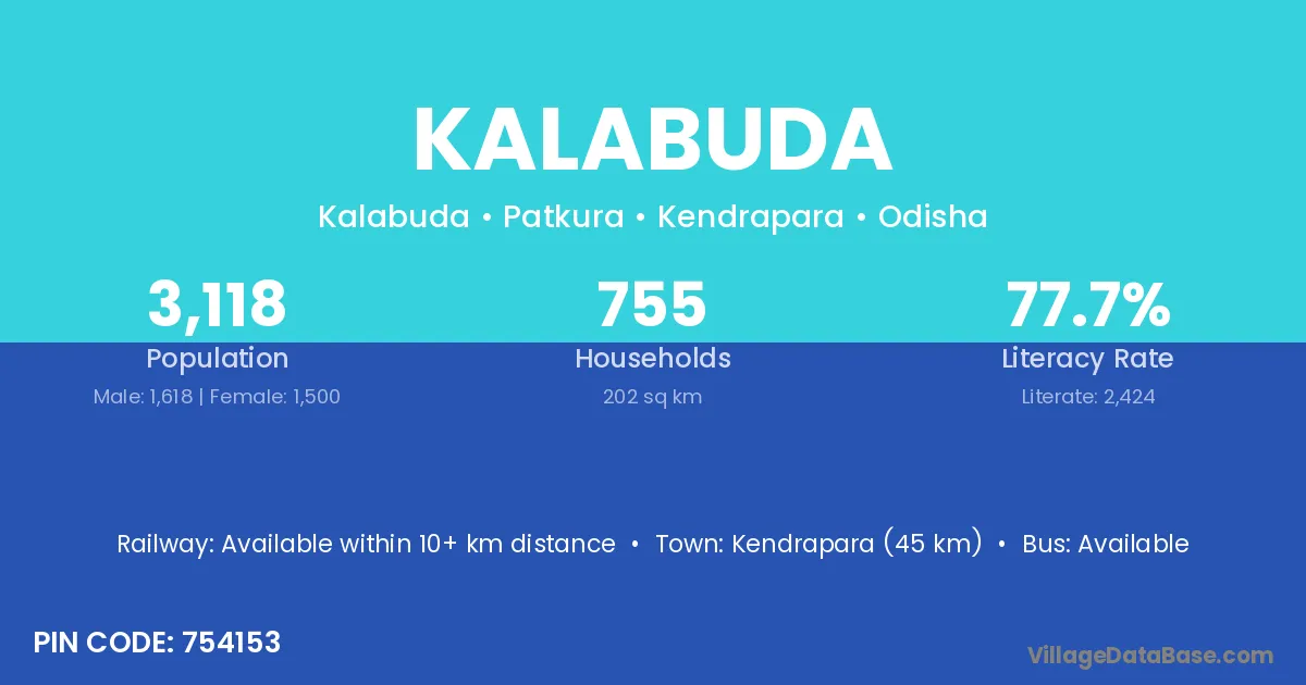 Kendrapara (45 km) is the nearest town to Kalabuda village for major economic activities and is located approximately 45 km away.