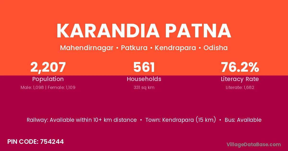 Kendrapara (15 km) is the nearest town to Karandia Patna village for major economic activities and is located approximately 15 km away.