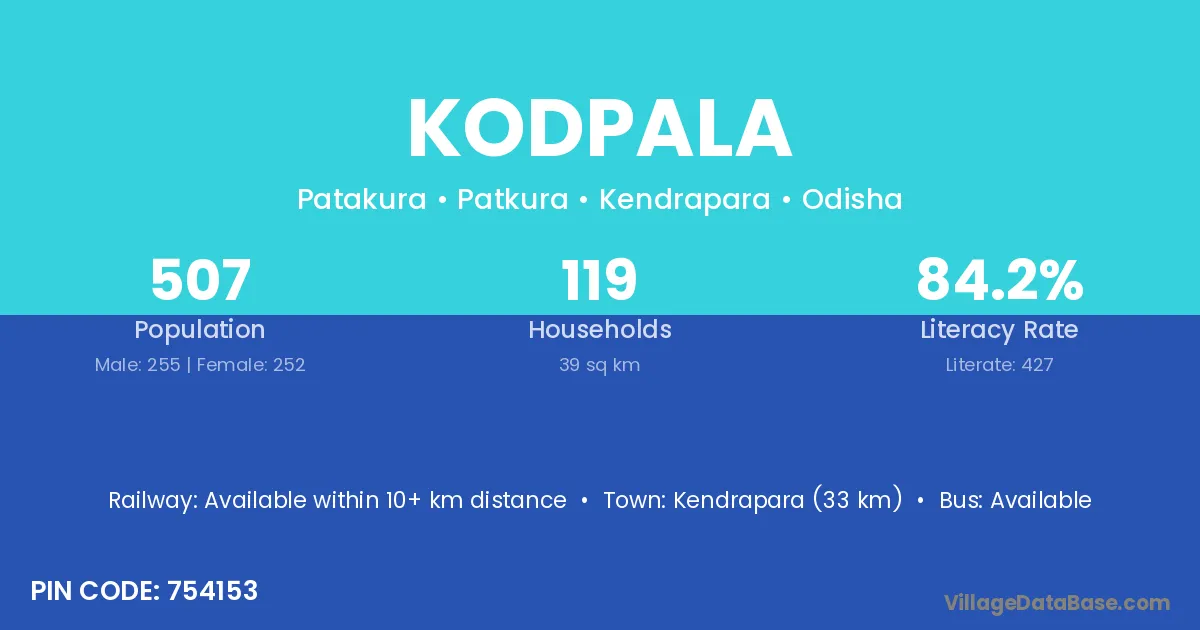 Kendrapara (33 km) is the nearest town to Kodpala village for major economic activities and is located approximately 33 km away.