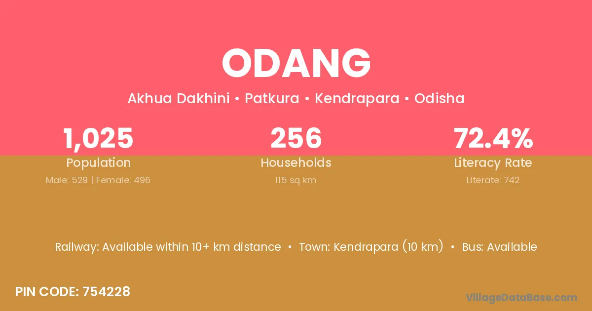 Kendrapara (10 km) is the nearest town to Odang village for major economic activities and is located approximately 10 km away.