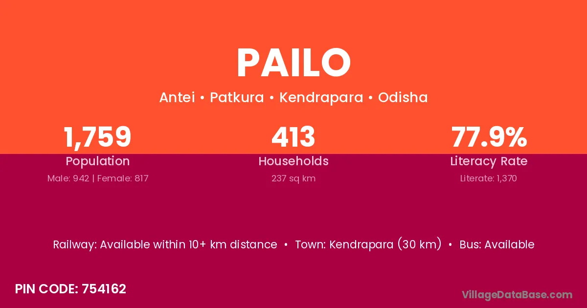 Kendrapara (30 km) is the nearest town to Pailo village for major economic activities and is located approximately 30 km away.