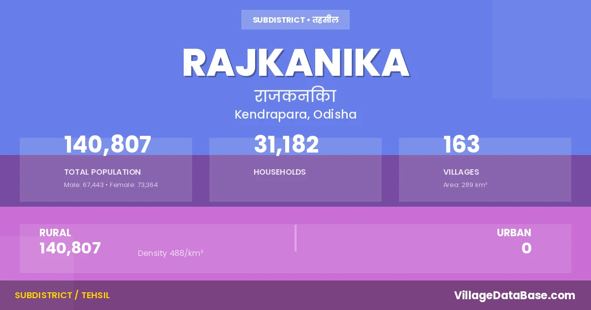 According to the 2011 census The total area of Rajkanika Tehsil is 289 km², with a population of 140807 people. The population density is 488 inhabitants per square kilometre, and there are approximately 31182 houses in the sub district.