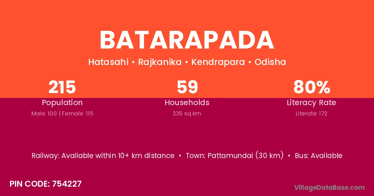 Pattamundai (30 km) is the nearest town to Batarapada village for major economic activities and is located approximately 30 km away.