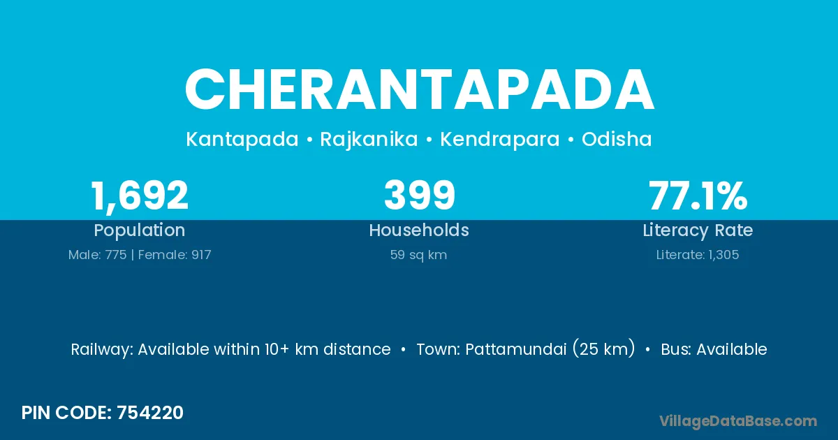 Pattamundai (25 km) is the nearest town to Cherantapada village for major economic activities and is located approximately 25 km away.
