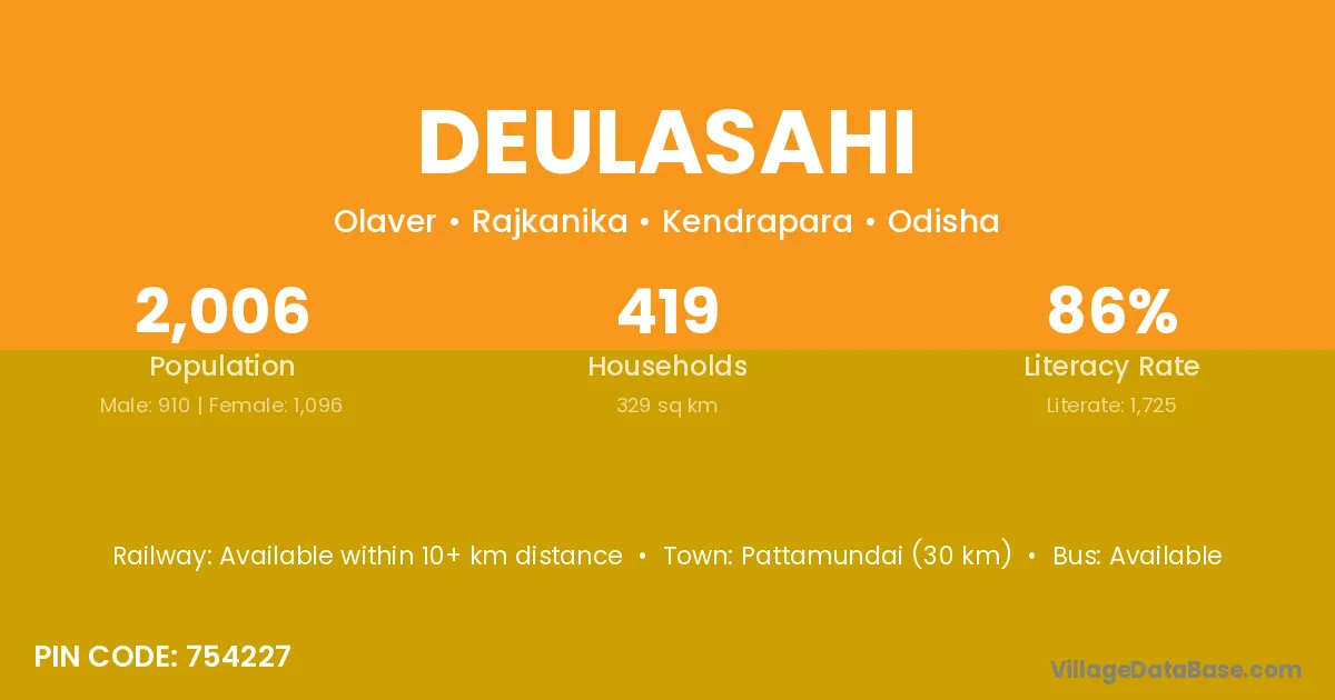 Pattamundai (30 km) is the nearest town to Deulasahi village for major economic activities and is located approximately 30 km away.