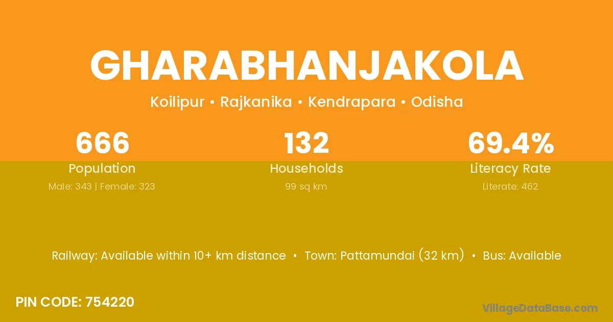 Pattamundai (32 km) is the nearest town to Gharabhanjakola village for major economic activities and is located approximately 32 km away.