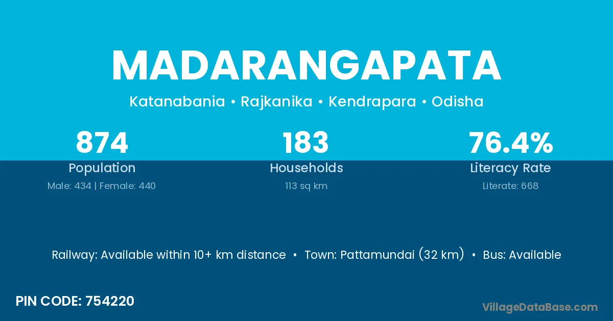 Pattamundai (32 km) is the nearest town to Madarangapata village for major economic activities and is located approximately 32 km away.
