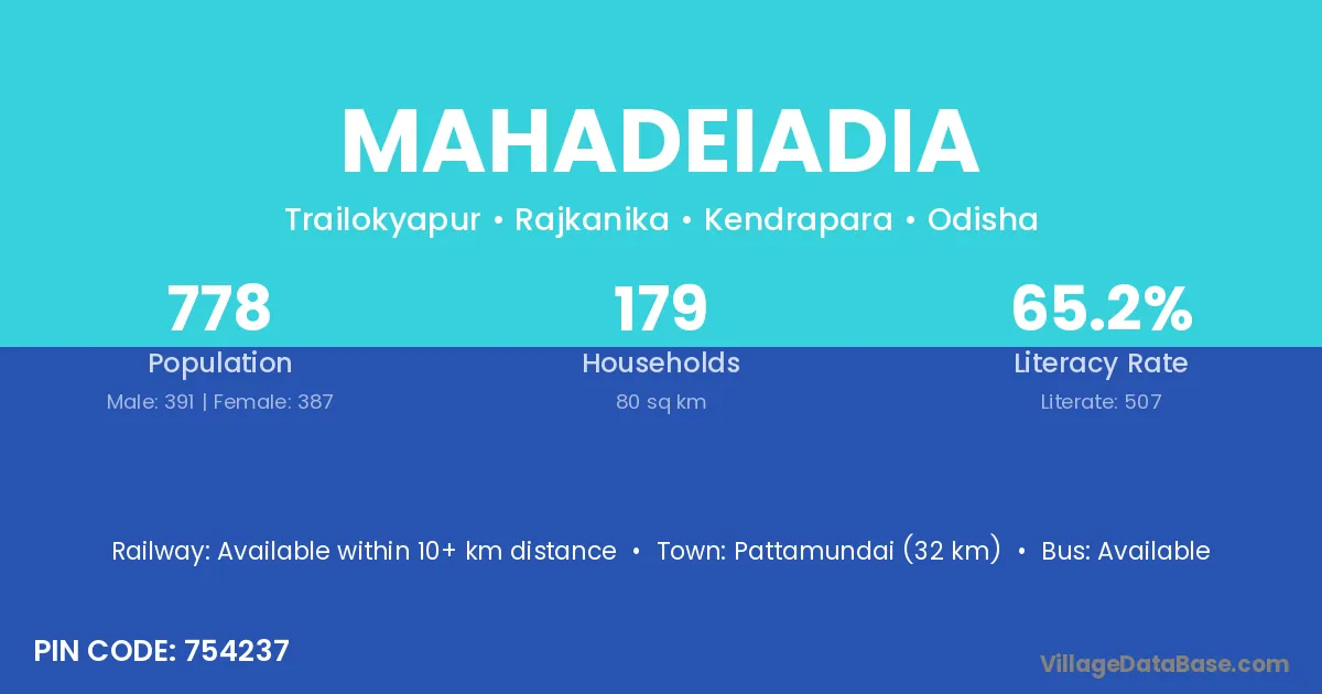 Pattamundai (32 km) is the nearest town to Mahadeiadia village for major economic activities and is located approximately 32 km away.