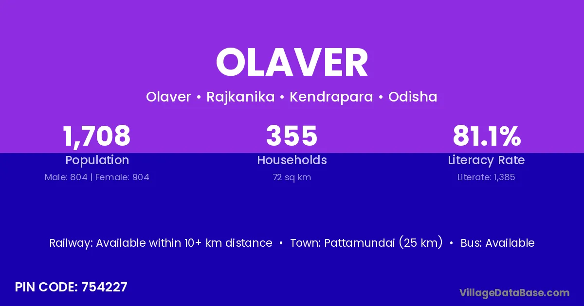 Pattamundai (25 km) is the nearest town to Olaver village for major economic activities and is located approximately 25 km away.