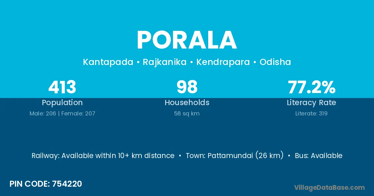 Pattamundai (26 km) is the nearest town to Porala village for major economic activities and is located approximately 26 km away.