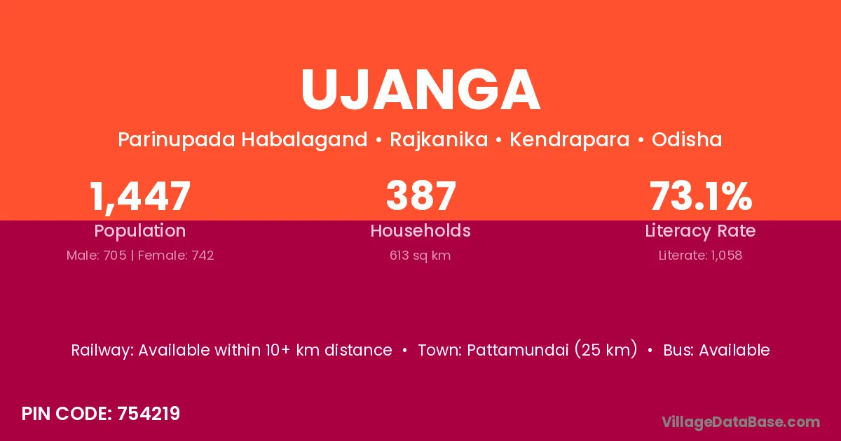 Pattamundai (25 km) is the nearest town to Ujanga village for major economic activities and is located approximately 25 km away.