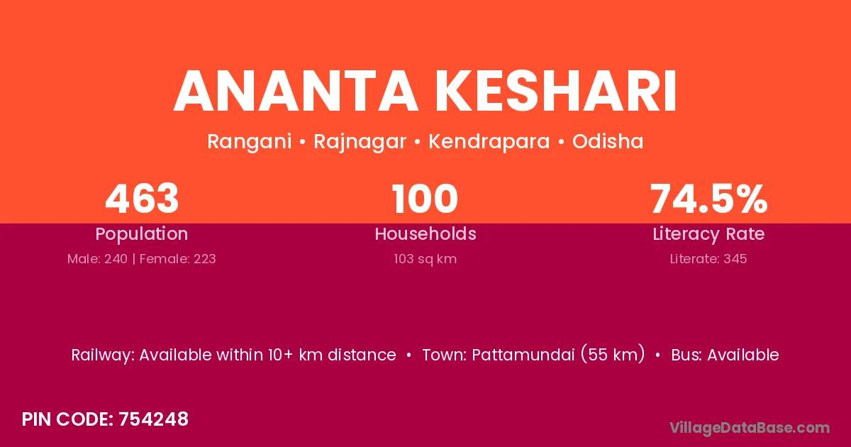 Ananta Keshari village has a total population of 463 people, of which 240 are males and 223 are females.