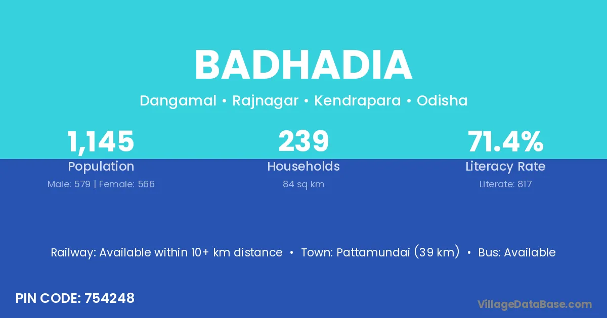 Pattamundai (39 km) is the nearest town to Badhadia village for major economic activities and is located approximately 39 km away.