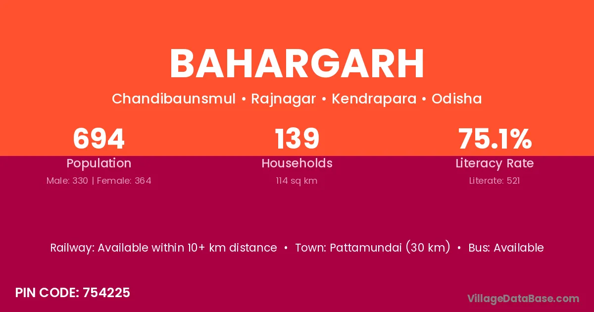 Pattamundai (30 km) is the nearest town to Bahargarh village for major economic activities and is located approximately 30 km away.