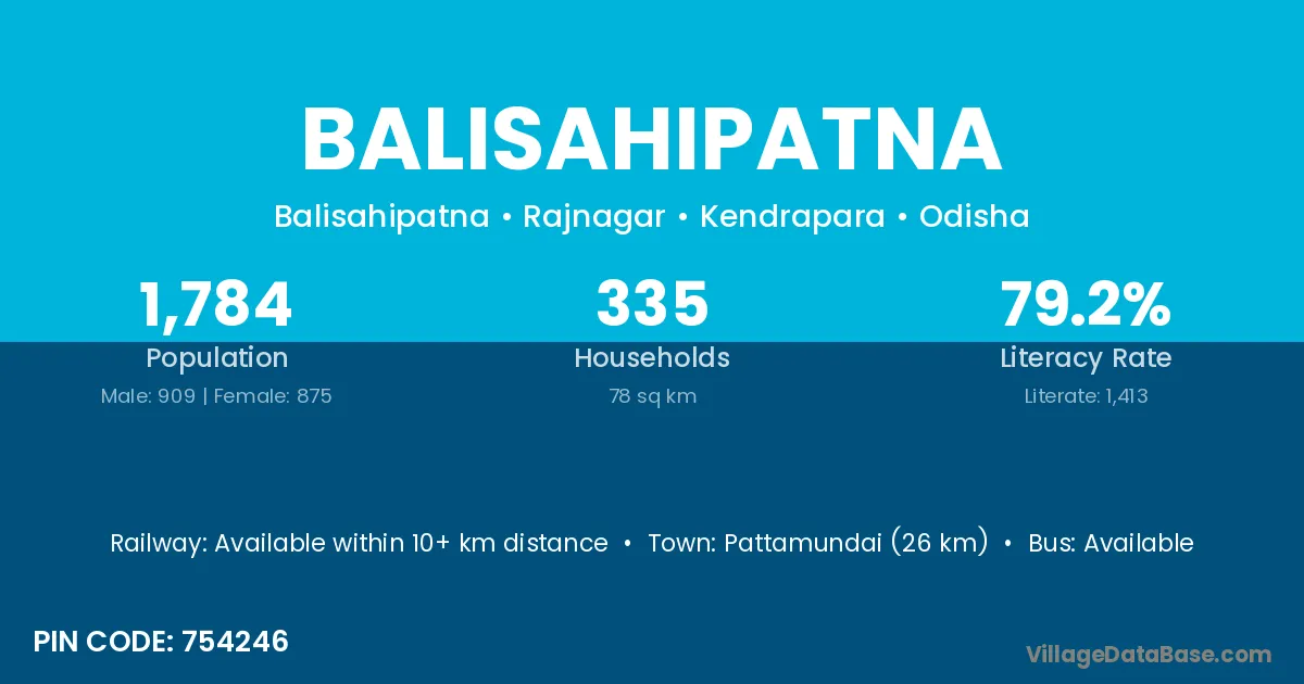 Pattamundai (26 km) is the nearest town to Balisahipatna village for major economic activities and is located approximately 26 km away.
