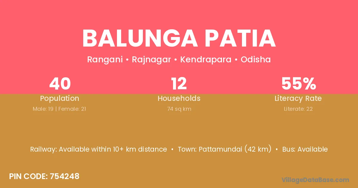 Pattamundai (42 km) is the nearest town to Balunga Patia village for major economic activities and is located approximately 42 km away.