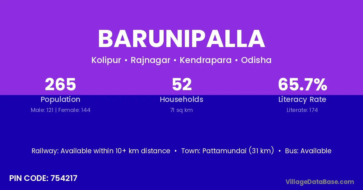 Pattamundai (31 km) is the nearest town to Barunipalla village for major economic activities and is located approximately 31 km away.