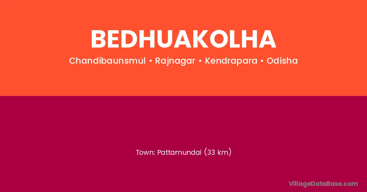 Pattamundai (33 km) is the nearest town to Bedhuakolha village for major economic activities and is located approximately 33 km away.