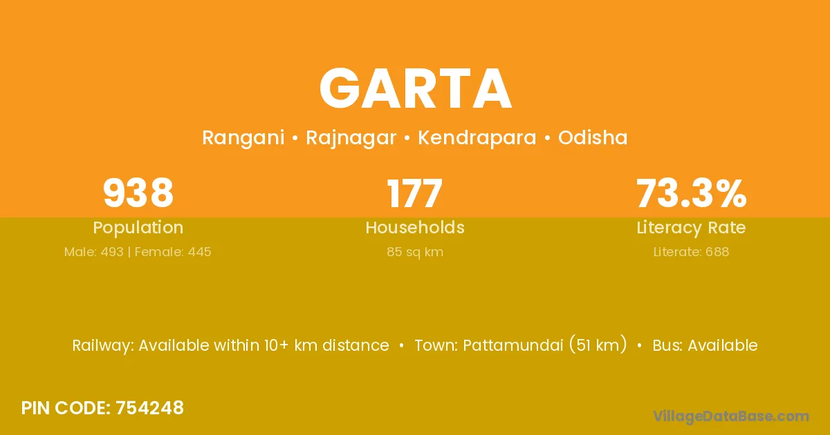 Pattamundai (51 km) is the nearest town to Garta village for major economic activities and is located approximately 51 km away.