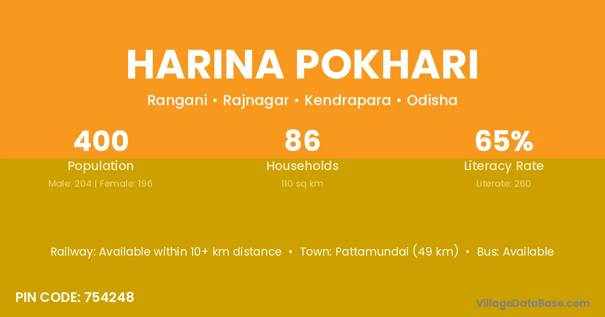 Pattamundai (49 km) is the nearest town to Harina Pokhari village for major economic activities and is located approximately 49 km away.