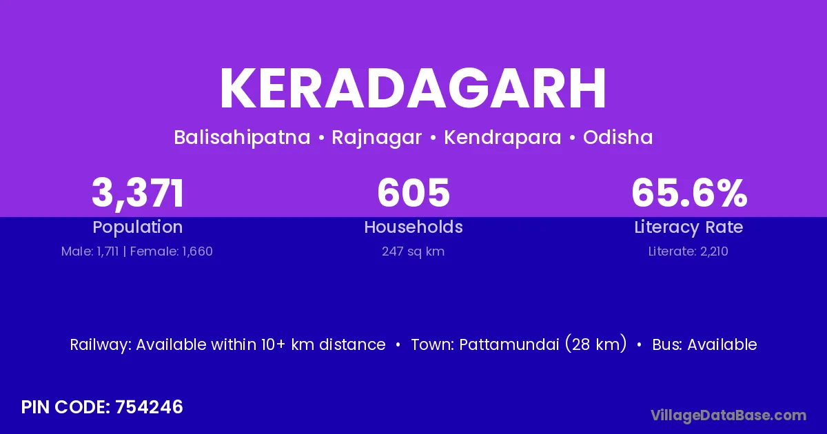 Pattamundai (28 km) is the nearest town to Keradagarh village for major economic activities and is located approximately 28 km away.