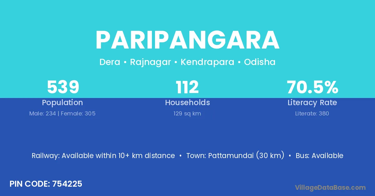 Pattamundai (30 km) is the nearest town to Paripangara village for major economic activities and is located approximately 30 km away.