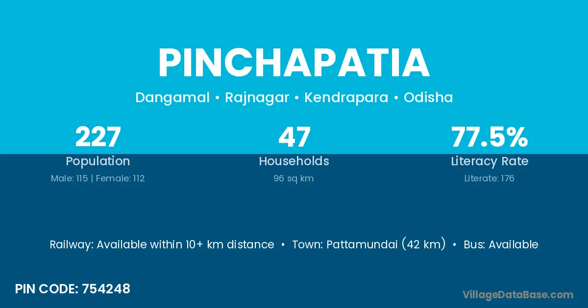 Pattamundai (42 km) is the nearest town to Pinchapatia village for major economic activities and is located approximately 42 km away.