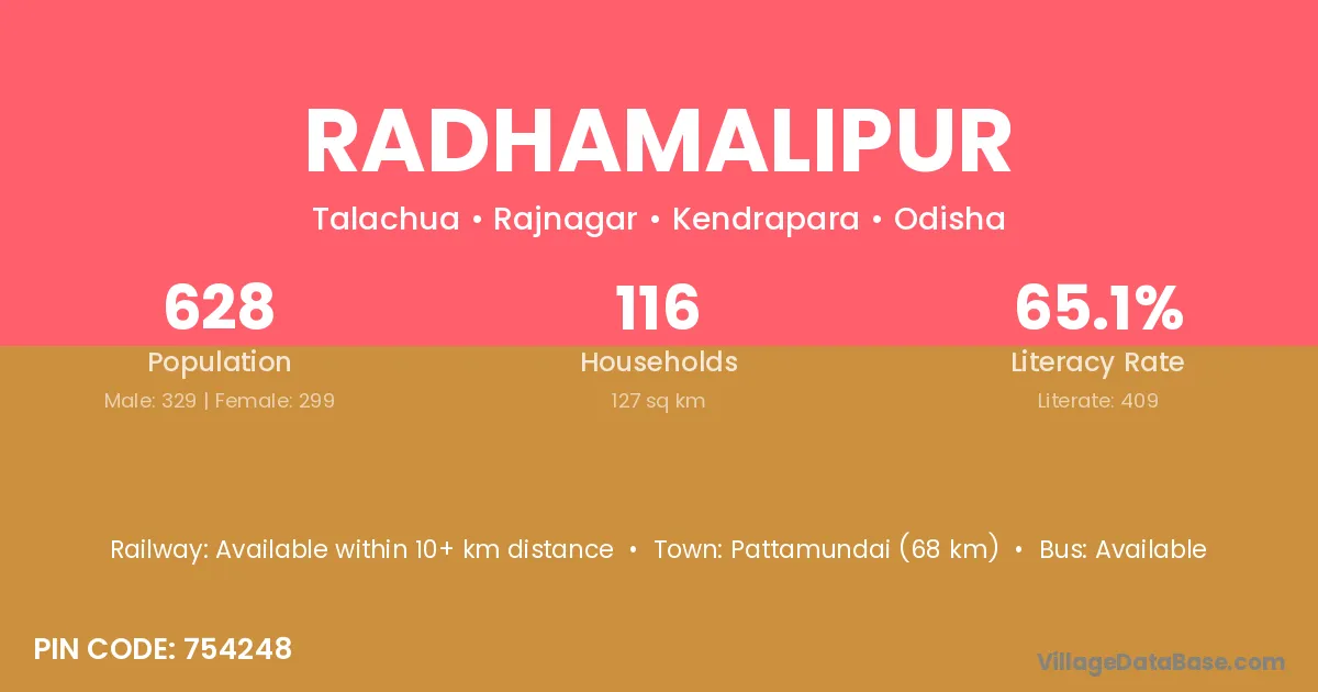Pattamundai (68 km) is the nearest town to Radhamalipur village for major economic activities and is located approximately 68 km away.